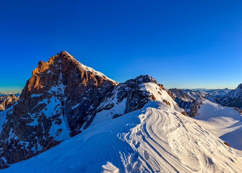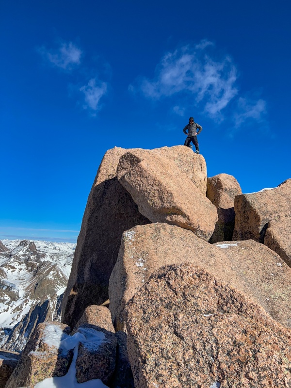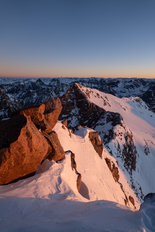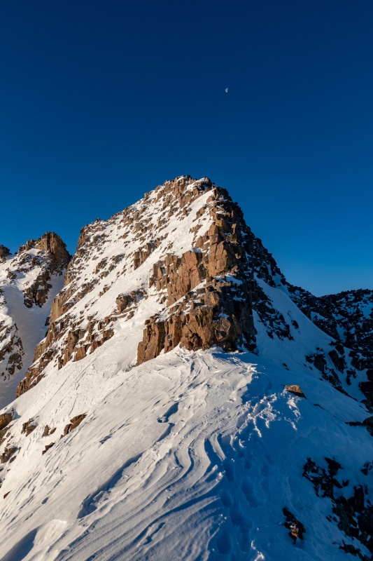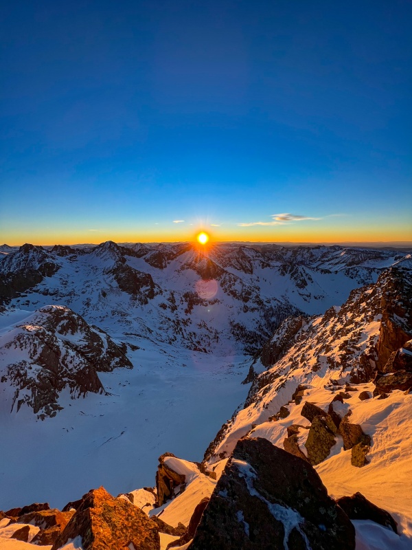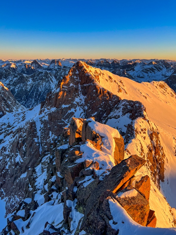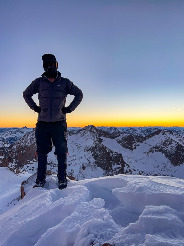 After getting back to the saddle, I put crampons on to ascend Eolus. The ridge to Eolus is a really fun section, I had done it this past summer so was fairly familiar with it. Far better than the standard route, which really isn't possible in winter anyway. Made it to Eolus' summit just as the sun began to rise, it was incredible. My favorite pictures this trip are from the summit of Eolus.