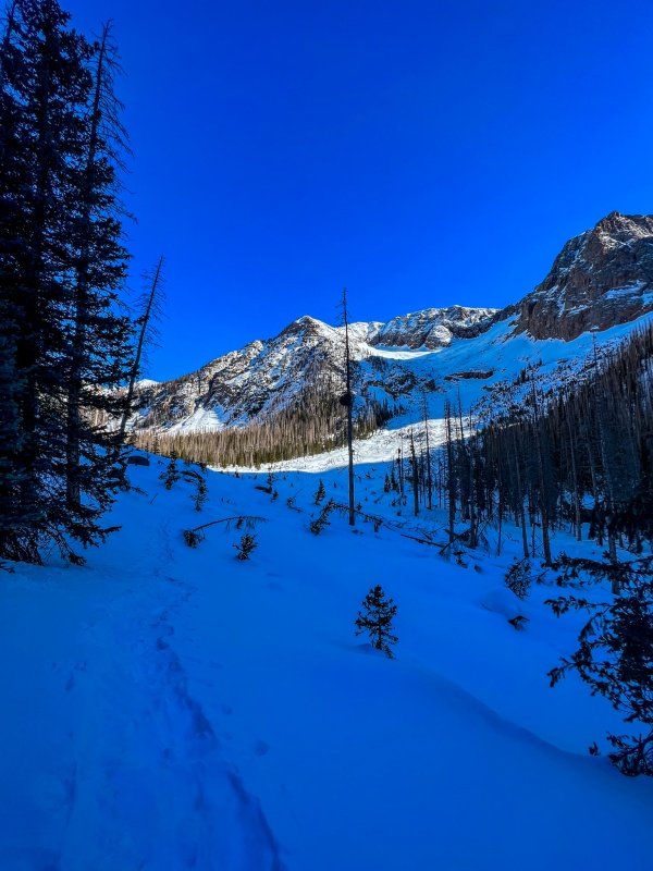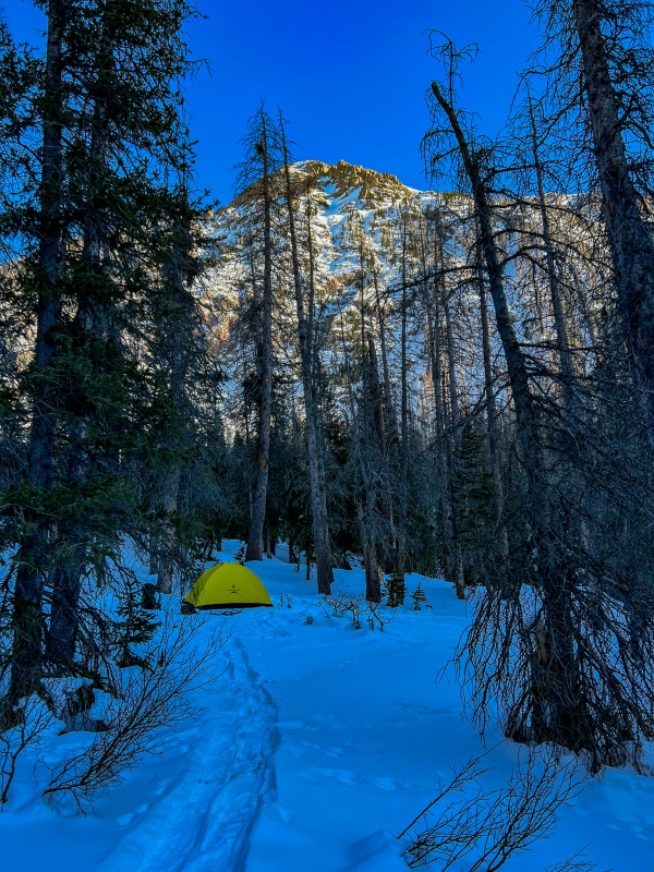 Beard had given me some great beta on a water source just above camp, so after setting everything up I put my snowshoes back on and took all my bottles up to find it. It was about a half mile away, and a complete lifesaver not having to melt snow. After filling all my bottles and getting back to camp, I ate some junk food and was in bed by 6pm. I set my alarm for 2:30 am, again unsure how long my day was going to be, but I really wanted to get all 4 peaks on Monday, as a cold front was moving in Tuesday and temps were forecasted to drop 10°-15°.