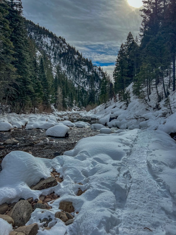 From the first part of the river I started climbing, there were 3 sections along this segment that had steep, stiff snow that you wouldn't want to slip on, you'd end up in the river.