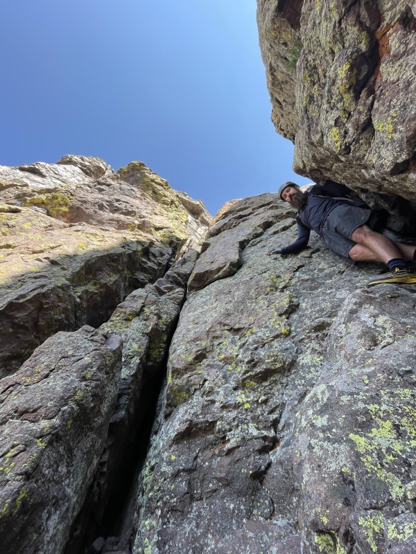 Day 6: 9/5 Silex (13,628’ / #181) The Guardian (13,617’ / #185) Return down Leviathan drainage to Vallecito to Columbine Pass junction The next morning we woke up and got after it. I know now that going near Silex Lake is not a fun activity for humans. It is straight talus and scree. Although we made pretty quick work of it, and managed to find some water along our traverse without having to dip down all the way to the lake, saving a bit of elevation change. Drop our packs below Silex. Tag Silex. Traverse. Ledges. Some easy class 3 and optional class 4. Hunt for the cairns. Tag The Guardian. My 99th ranked peak of the summer. Beautiful. Almost hot. Such a clear day. Formulate a plan to drop down and get ourselves in position for Jupiter and Grizzly C the next morning. So grateful we received a weather window to get out in the Wemi. Back to the packs. From here, the drop down the Leviathan drainage was my least favorite part of the trip, other than the descent of Peak 7. I’d rather be suffering uphill any day. I became so frustrated and irrationally angry for about 10 minutes, but it soon passed and I was back to joking around with Twinkle. Some faint use trails, some complete guess work trying not to cliff out, and some shwackin’. Cross the Vallecito and back on trail and all the way down to the junction with the Columbine Pass trail. We were planning on hiking further up near the pass, but decided to set up camp right at the junction since we could no longer see the sun and were feeling the effects of six straight days of hiking. We ran out of fuel with our shared canister, and I was reluctant to ask another group for fuel, so I went for the cold soak double ramen and jerky.