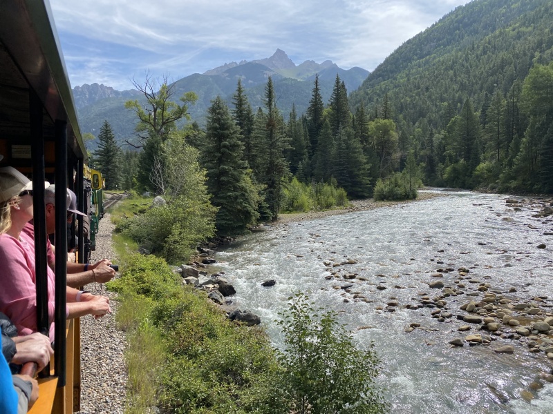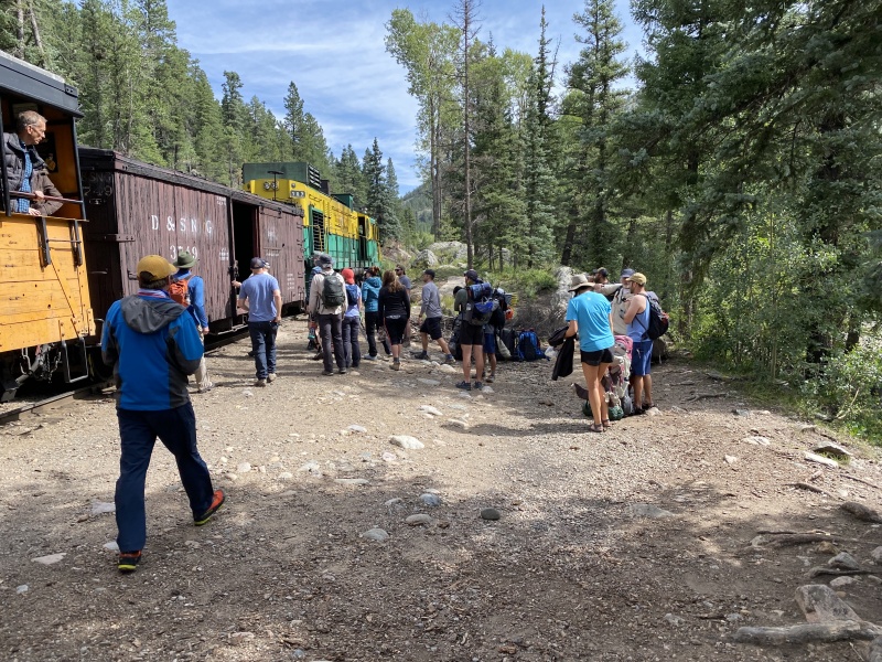 I started my senior project planning in early June, first trying to understand the complexities of the railroad schedule for backpackers. [2021 summary: only one diesel train per day to Needleton for backpackers; must depart/return from/to Durango; limited backpacking parties per day; reservations by phone only.] Then, I looked at as many trip reports and condition reports as possible to try to find the sweet spot on the calendar after the snow melts, with a low chance of monsoon rain and before autumn snow might arrive. My conclusion—there is no sweet spot. I decided to make Tuesday to Friday train reservations for the second and third weeks of August. If weather didn’t look favorable for the first reservation, I would delay by a week—being semi-retired provides more flexibility than I used to have. My plan paid off with a break in the monsoon just after downed trees were cleared from the trail on August 7th and just before an initial snowstorm on August 20th. [June 2022 note: I have heard rumors of August 2022 train reservations already becoming scarce; also, there is a new policy where even diesel trains can be cancelled on days with Red Flag fire danger. See resources section at end of report for some trip planning references.] On the Friday before the first reservation, I checked the extended weather forecast and was pleased to see that the coming week was expected to have a break in the monsoon from Monday to Thursday, with almost zero probability for rain on Wednesday. On Monday, I drove from Denver to Durango arriving in the afternoon in time to pick up my train tickets and cancel my second reservation for the following week. Durango to Needleton to Chicago Basin: August 10, 2021 I left the motel very early to avoid any risk of being late. I waited patiently by the train until the conductor opened the baggage car door and hoisted my backpack inside. I was excited to get going, but had no option but to wait for an “All Aboard” call followed by a 2.5 hour ride to Needleton. Backpackers ride in an open gondola car just behind the baggage car and diesel engine. Being outside was chilly, but I knew that every nose on the train would appreciate the ventilation on the return trip. I’ve been on the Durango and Silverton Narrow Gauge Railroad a few times before, but never as a backpacker and never with a smartphone. Like everyone else, I enjoyed taking too many photos.