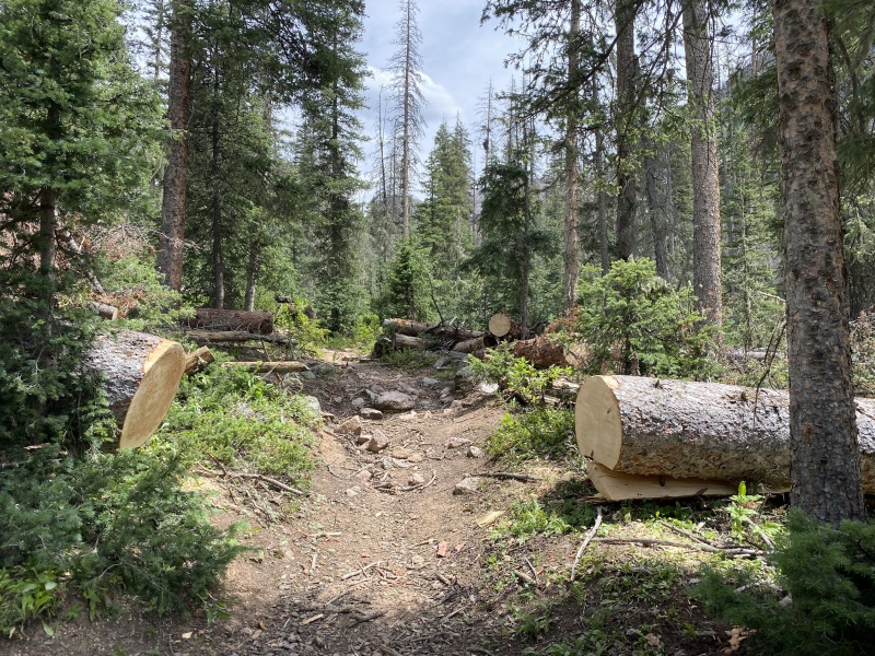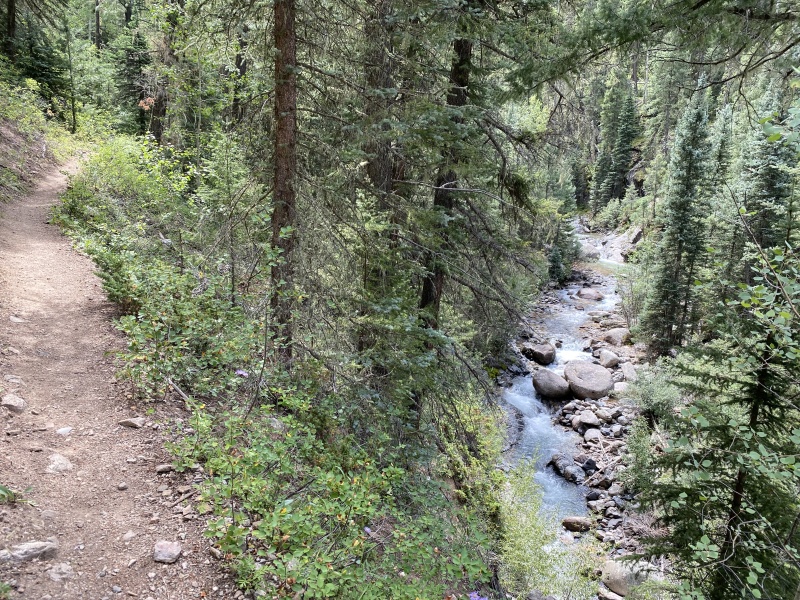 The train pulled into Needleton at 8200’ elevation at 10:30. Offloading my backpack from the baggage car, I was already getting warm. I adjusted layers to shorts and t-shirt and proceeded across the suspension bridge. Within 30 minutes, I was in my traditional caboose position behind all other train passengers and was enjoying the wilderness solitude and creek-side scenery. I wasn’t completely alone. A steady flow of downhill groups and an occasional Purgatory party swooshed past me. I was feeling fortunate in my choice of dates as there weren’t any mosquitos, the skies weren't too smoky and all the fallen trees had recently been cleared from the trail. In the upper parts of the Needle Creek drainage, I estimated that over 70% of the trees were needle-less, so deadfall will likely continue to be a yearly challenge. As the trail started to flatten out, I exited the trees and rounded a corner to dramatic views of the highest summits. This seemed like a fine place to set up camp especially since I was concerned that any higher camp sites might already be occupied by faster folks.