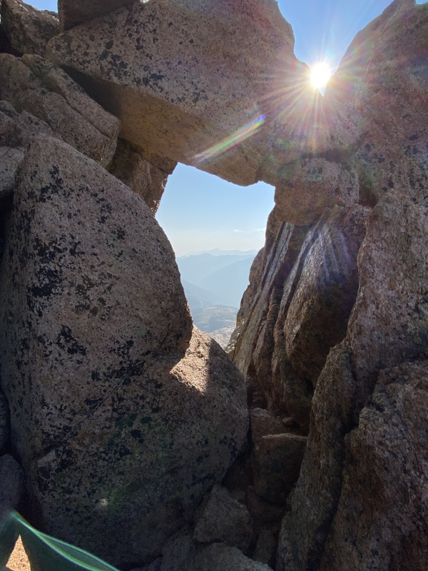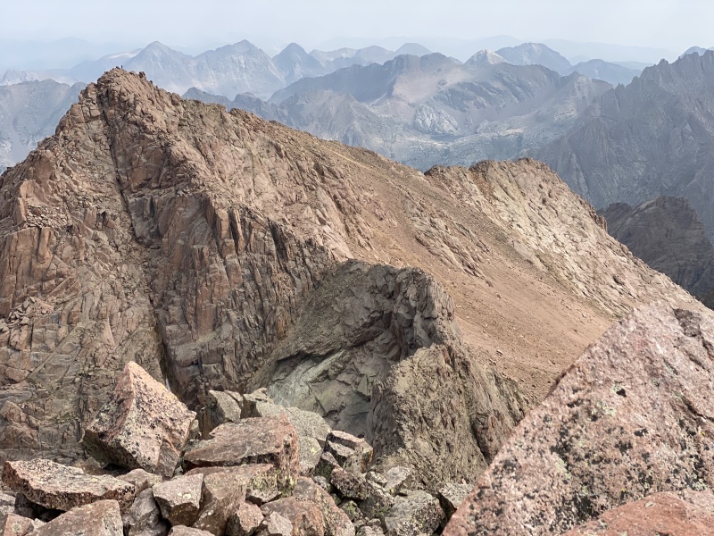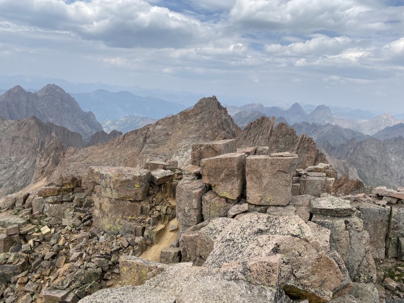 I had the summit to myself for a minute before another large group caught up to me. After tightening my shoe laces and taking several deep breaths, I started up the final stack of jumbled blocks above the main summit. Standing on the second to last block, I carefully turned around and scooted my butt onto the highest block. Between short breaths, I quickly took some photos. Surging adrenaline means I didn’t have much memory of ascending or dismounting the summit blocks other than each time I made a long step or a quick jump, my approach shoes provided plenty of friction.