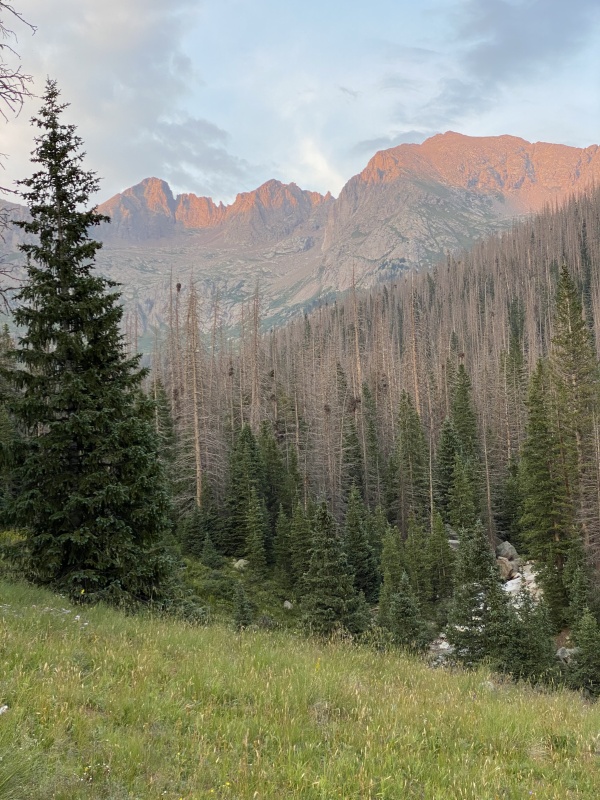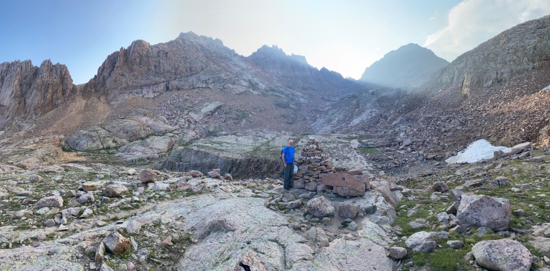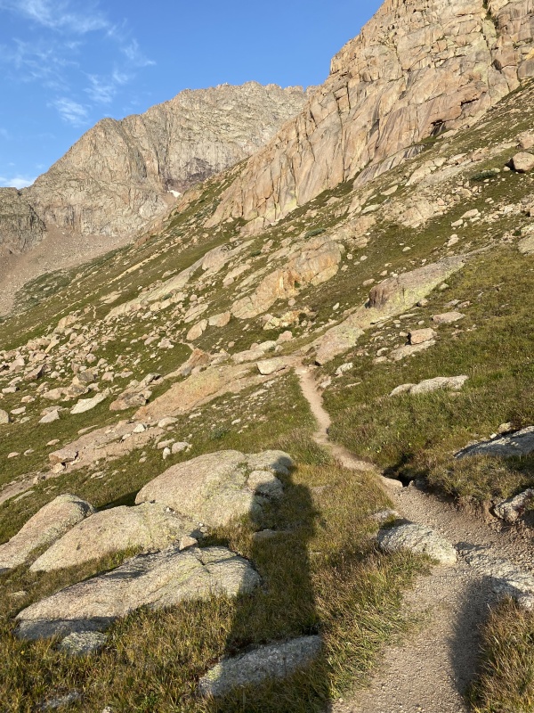 Windom, South Windom, Jupiter Sunlight Peak and Windom Peak: August 11, 2021 I was on the trail by headlamp at 5:00, after getting the day's food out of the tree and putting my sleeping bag into my hanging pack. It was nice to have a fairly flat mile for getting warmed up, passing many campsites along the trail until branching off toward Twin Lakes. Although steep, the trail was easygoing thanks to the many steps and switchbacks constructed by the Colorado Fourteeners Initiative. I paused for a break at Twin Lakes as the sun started to light up the clouds above Sunlight Peak. The feeling of connection to the light, sky, mountains, rocks, and lake gave me the spiritual high that I often find in the mountains.