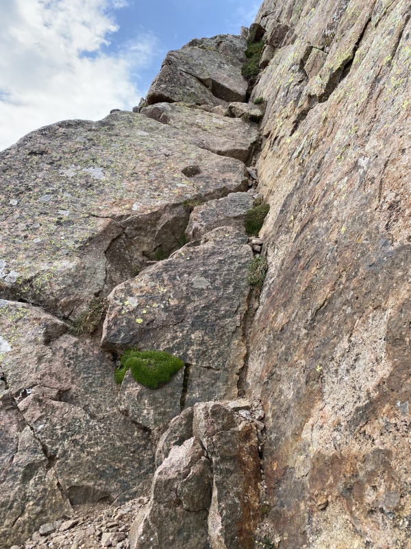 Unfortunately, at the top of the ramp, I started climbing up toward the catwalk too soon. I had to retrace my steps and then curve further north before I could see the now obvious low point on the ridge below North Eolus. I enjoyed climbing the short crack to the saddle and then turned left to cross the catwalk to Mount Eolus. Although the rock is solid and several feet wide, the exposure on both sides was freaking me out, so I switched to a bear crawl for many segments. This produced another adrenaline surge which may have impaired my route finding for the final climb.