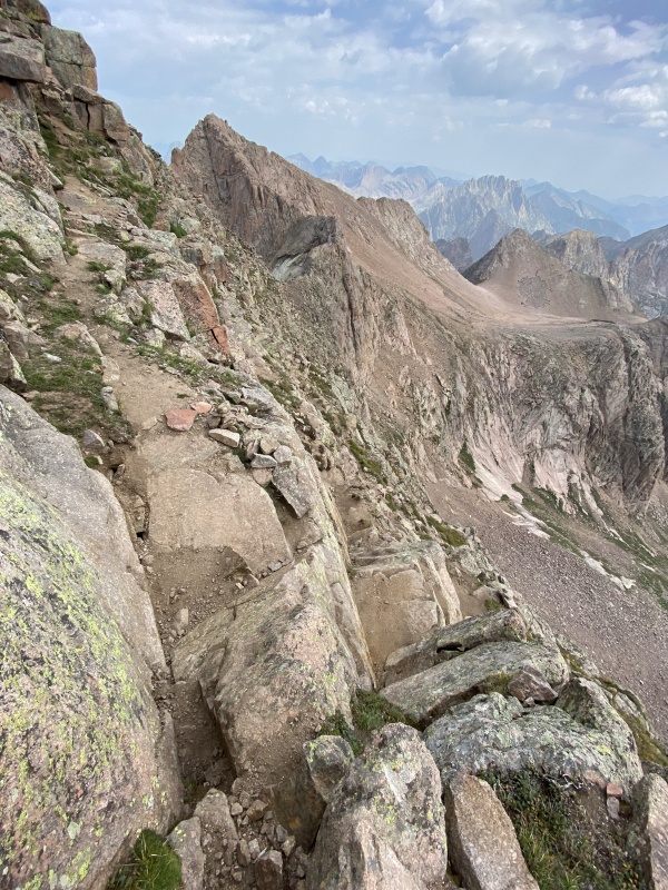 The trail toward Mount Eolus has also been improved by the Colorado Fourteeners Initiative with well-defined steps to 13,000’. From here the route ramps up solid slabs to the northeast and then curves north.