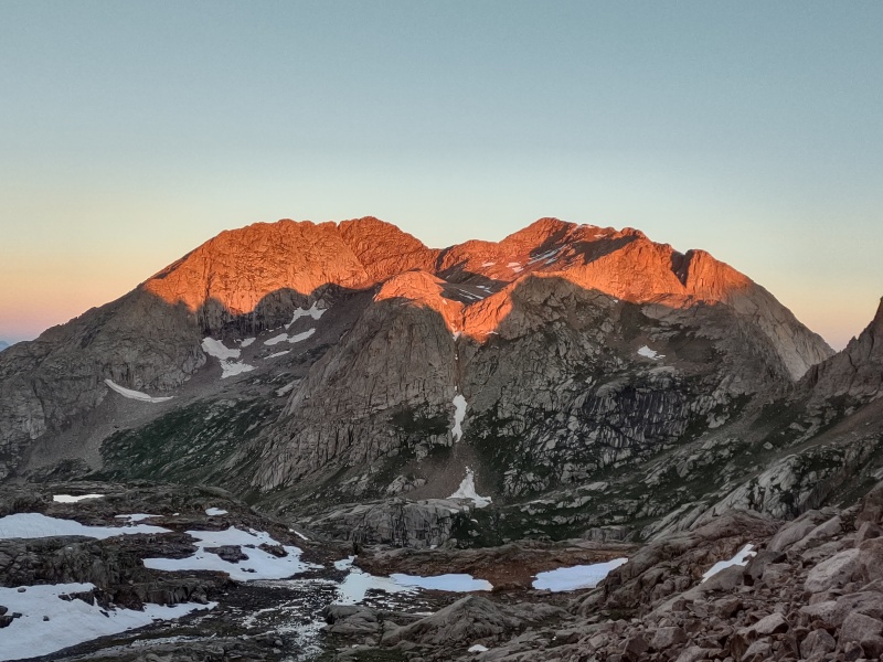 Jupiter, Centennial 13er On the morning of the third day we hit the trail a little before 2am with the hopes of tagging Eolus and North Eolus and getting back down in time to tear down camp and make it back to Needleton for the 3pm train. But these back to back days of exertion had Geo running out of steam a little below Twin Lakes at around 12,400ft - after ~1,200ft of elevation gain that morning. After waiting and resting for a while, Geo wasn't feeling well at all and decided that the Eolus peaks just weren't going to happen this trip. I had already done those peaks previously and was more interested in getting Jupiter. After a consultation with the guides, with Kurt giving me some verbal description of the route and confirming that I had gpx tracks loaded and that I felt confident doing the route alone (I knew I could probably move faster that way anyways), I headed off solo so that the guides could make sure Geo got back to camp ok. I will say that for anyone heading up this peak before sunrise it's a VERY good idea to have gpx tracks loaded since the trail, once it branches off from the main trail going to Columbine Pass, is very hit and miss and winds and weaves up through some rock bands. If I hadn't had the gpx tracks loaded I would have likely ended up waiting for sunrise to go up since some of those rock formation would likely be treacherous in the dark, but in daylight and/or with the gpx tracks it's much easier to figure out how to weave through them.