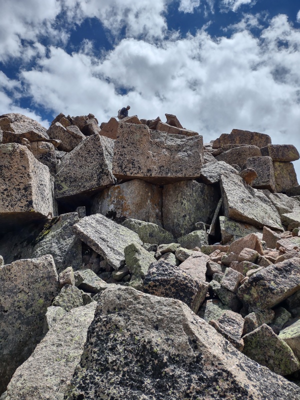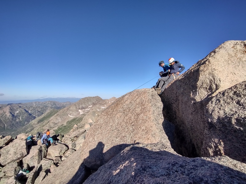 Sunlight Summit Block with Ropes As explained in the backstory, Geo's nearly fatal fall just under a year ago is what prompted hiring a guide to help with restarting the quest to finish the 14ers. Since some people wonder how someone would even make use of ropes for Sunlight's infamous summit block, I'll stick in a few photos here while leaving the more complete account for Geo to tell.