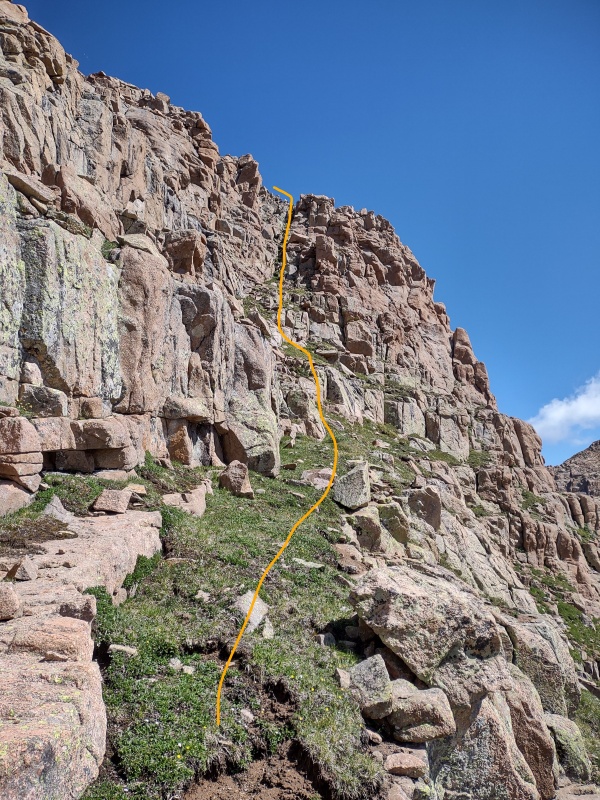 There are all sorts of options for getting to the top, especially if you don't mind class 4 or higher terrain, but you also have various options to keep it class 3. One of the easiest to identify is to pass underneath a large, slanted green ramp that can be seen clearly as you approach from Windom and during much of the time you're coming up onto the SE face. After you pass below that ramp, you get a great view of Chicago Basin and then can turn back and see a grass gully going a significant portion of the way to the summit. This is a simple class 3 gully with some easy class 3 rock scramble up to the summit from there.