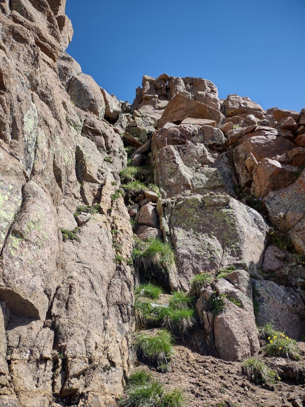 The easiest way to climb Peak Eighteen is to go up to the saddle with Windom, as if you were climbing that 14er, but then turn right at the saddle and follow the ridge over a small hump. After a drop you then start up to Peak Eighteen. I'm told and can easily believe that a ridge direct climb up Peak Eighteen would be class 4 and I wouldn't be surprised if some lines are likely even class 5. But it's fairly easy to keep this peak as class 3, if desired, by cutting to the left and travelling along some grass ledges that are filled with all sorts of beautiful wildflowers this time of year (you have to step carefully to avoid crushing any flowers).