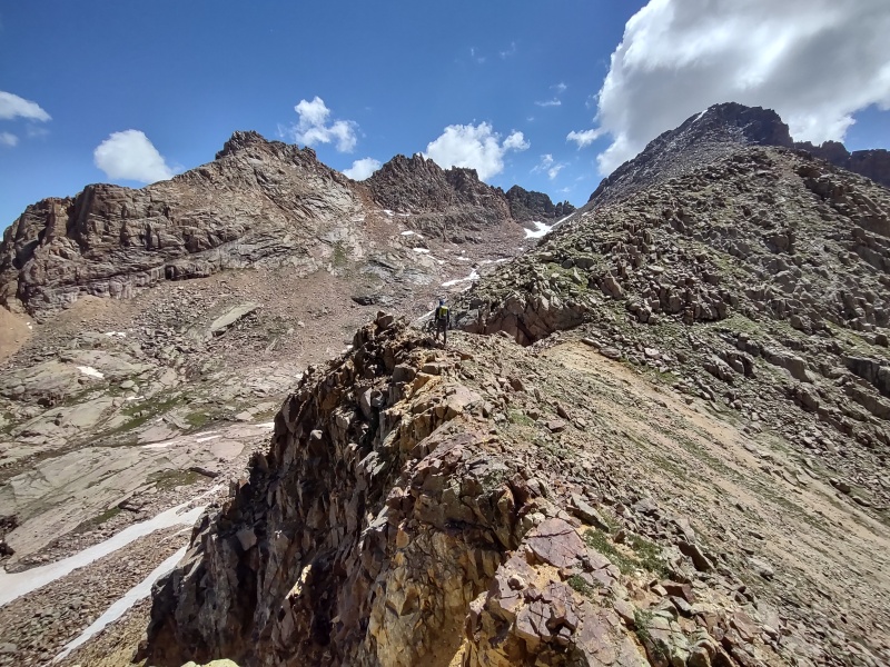 The Backstory If you're only interested in beta, you can skip to the next section header as this section will tell the tale of why a guide was hired for a group of peaks that most people (including myself, the last time I was here) solo and how I ended up being a part of this journey. My first encounter with Geo was back in February 2020 when I received a PM after Geo read my trip report of doing Sniktau, Cupid and Grizzly in winter and being disappointed that I didn't have enough gas to get over to Grays and Torreys and back. So Geo suggested we team up and do a carpool route from Loveland Pass to Grays summer trailhead at Bakerville. So we did and that was a very successful trip. Like other times I've occasionally teamed up with folks on the forum, we both parted with "let's do this again sometime" but sometime never really seemed to roll around. That is until October of that year when I got another PM from Geo asking if I'd be willing to redo Snowmass Mountain. At that point in time I wasn't too excited about repeating peaks but there were 3 effective lures that enticed me to say yes: 1) The suggested route was S-Ridge - a neat, challenging class 3 variation. 2) The road to get to the trailhead was Lead King Basin - a challenging 4WD drive road of the type for which I had purchased my Jeep Renegade Trailhawk. 3) There was a nearby 14er sub-summit (North Snowmass) which I hadn't done yet and which Geo was willing to wait on Snowmass while I went over and tagged it. After that long but successful day we started teaming up more often on various class 3 ridge scrambles, winter peaks, etc. Then came the fateful day of July 6, 2021. Geo had 10 14ers left and had gone out that day with a couple guys to try to take Pyramid Peak off that list. Things went well until the final section just below the summit, where the route can be kept class 3 if you pick the right lines up through the ledges below the summit... That afternoon me and another friend who had hiked together recently got the following text: "Guess who's not climbing any fourteeners until next summer!" followed shortly by the explanation: "I fell 50ft just below the summit. I obviously got really, really lucky that I'll recover fully, but I have a spinal fracture and a broken heel." Turns out Geo landed on a shockingly small ledge - had the fall not ended there it would have certainly been fatal. Over the year since then Geo has been on a long, slow, painful road to recovery. The broken heel would more accurately be described as completely shattered. Geo spent a long time barely able to get around at all. I joined in with some others in helping out during this time and as Geo slowly regained the ability to start doing short, simple hikes I decided to dial back my own 13er ambitions and accompany Geo on whatever short hike was feasible at a given point in time. Finally the time came when the healing was adequate and the snow was melted sufficiently to resume the quest to finish the final 10. With the San Juans melting the fastest, the Chicago Basin was chosen as the place to start. I wasn't originally planning to go until some changes at work created a window of opportunity. We had done a couple peaks together over the winter but this would be the first new 14er and first class 3/4 terrain Geo tackled since the fall. Thus the decision was made to hire a guide from the San Juan Mountain Guides who could short-rope Geo through the class 3 sections as needed and provide a belay up onto Sunlight's summit block. Chicago Basin and the Train Some people look down on doing the Chicago Basin this way but to me, the train ride in is such a neat and classic experience that I think everyone should do it at least once. Even once the train drops you at Needleton you still have to hike in 6 miles or so with around 2,800ft of gain with a full pack to setup camp, so it's not like taking the train turns it into a trivial hike by any means - it just spares you the 15 mile hike in from Purgatory (and the 15 mile hike out to Purgatory with 800ft elevation gain at the very end of that journey). As of late June 2022, there was some significant wash-out on the trail creating big ruts which would not be fun if you discovered them suddenly in the dark...