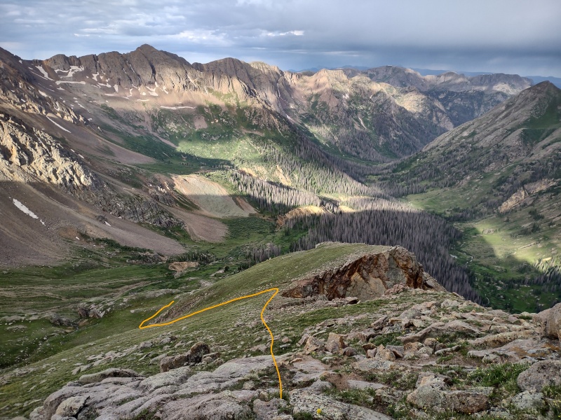Going back down you can either retrace or pick any number of options depending on how interesting you want to make it. Then you have to regain a small hump if you want to go to Windom or drop to the left at a favorable spot to get back down to the valley between Sunlight and Windom.