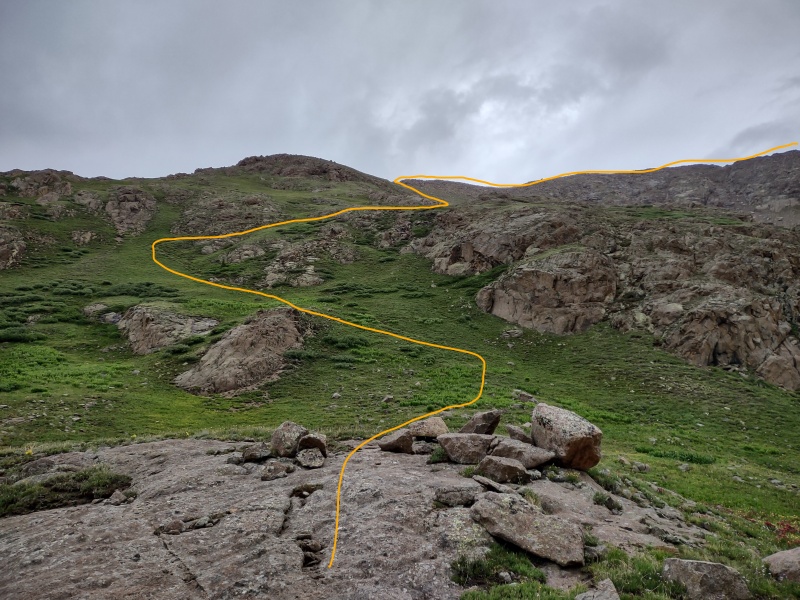 From Chicago Basin the route up follows a very solid trail to Columbine Pass. When doing the 14ers there's a sign indicating a left turn to go to Twin Lakes. Just go straight instead towards Columbine Pass. The trail was pretty wet/muddy when I did at for this late June trip. The turnoff for Jupiter at another stream crossing is not well defined but you'll eventually spot occasional good trail segments.