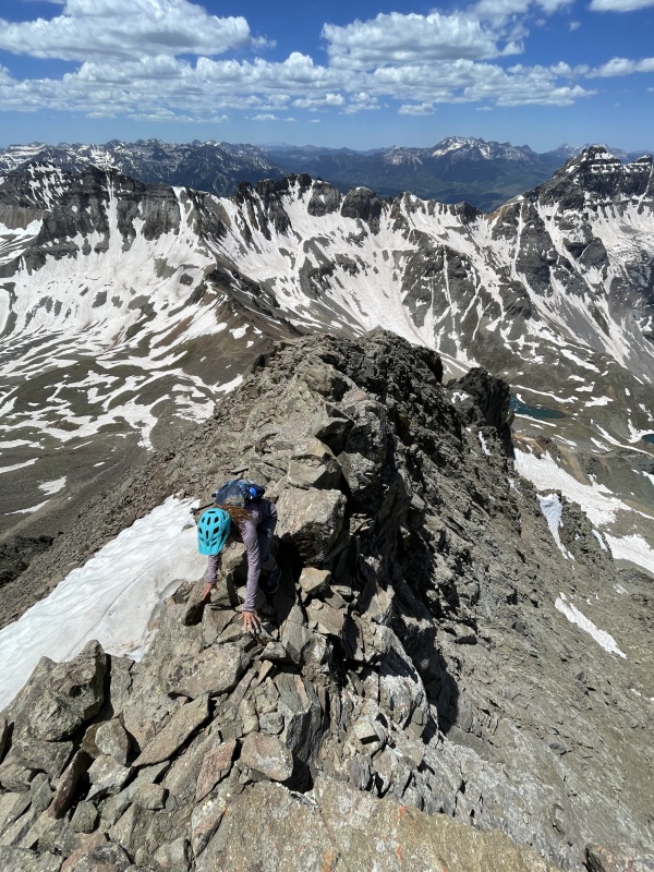 Day 3: Eolus, North Eolus, little finger camp @ 13,000’ I had originally pitched this to Zofia as a chill lake day going over twin thumbs in order to get ready for pigeon and turret via ruby basin. But something was calling me to go over North Eolus to the little finger saddle and to hit ridge direct on Eolus along the way. Especially since our forecast was looking amazing and Zofia had a full day of rest. All signs we’re pointing to the hardest and more unknown option being a go. We still ended up making this a chill lake day though. We packed up early and hiked up to Twin Lakes where we took ~90 minutes to soak in the sun and jump in the snow melt a couple of times. Goats surrounded us and flies hounded us for any hint of salt or mineral. The animals and insects are pretty aggressive around these parts. Time turned into us filtering some water and heading up the Eolus/North Eolus saddle with full packs. Once at the saddle, we did our best to hide our packs and secure them with some rocks while we tagged Eolus via ridge direct. I had been up the standard route before, but wanted to see what the ridge / winter route was all about. And it’s all pretty solid class 4. Highly enjoyable and recommended. Probably the most fun we had on the entire trip. We even felt good enough to return back directly down the ridge. Back at the saddle we secured our packs from a marmot that was finally getting close and headed up North Eolus. It was roughly 3pm at this point. There were basically no clouds within a few miles of us during monsoon season. This is great. We are so fortunate we had a weather window to complete this day as it is without incident or trouble. (NOAA had a 10% chance after noon) Once we were done celebrating Zofia’s 6th & 7th 14ers, we dipped off the top towards the relatively unknown with full packs. We brought some water but I knew it would be really helpful if we found some snowmelt on the north side of north eolus, especially if we were going to potentially dry camp. I did not do the best job of scouting the north side of north eolus. I chose to dip off the left/west into a high 4th / low 5th dihedra pretty quickly after leaving the summit. I handled it with ease but Zofia really did not enjoy this part while having to balance her full pack. I found a way to securely spot her down the most difficult part, but it definitely took us a bit to get down. There might be an easier way off/onto this ridge, but I did not necessarily scout it as it looked potentially even more convoluted, and I was more focused on what was ahead.. Once on the ridge, I underestimated how quick Zofia might be. Despite showing excellent skill on class 1 trail and 3rd/4th/5th class rock while ascending, she was still unlearned in the art of managing descents on loose 2nd class. The ridge itself is loose class 2 and maybe class 3 in spots and goes all the way to the little finger saddle, where we arrived just short around 4 hours later at 7pm, meaning we we're sleeping at 13,000’. Thankfully, along the way we were able to locate water from a large patch of snow. It took about 20 minutes to move enough rock and dirt around to create a clean flowing stream I was able to harvest, but we were able to grab enough to replenish about 2.5 liters each. Without this source, we surely would have been a bit dehydrated the next day. The sunset at 13,000’ from the saddle while viewing peak 16 and little finger was stunning. Top tier. Barely any clouds. We slept without a rain fly or a worry in the world about the weather. We couldn’t exactly find a perfect flat spot, but we found something close on a semi-exposed gravel patch where we cooked dinner and shot photos until the stars arrived to start their show.