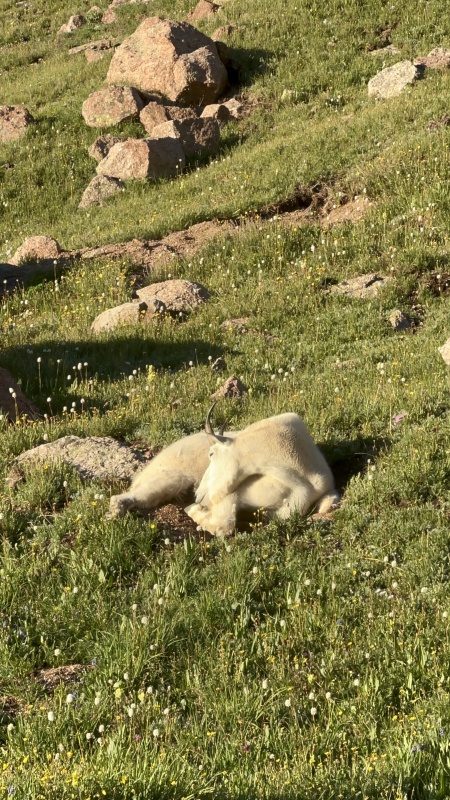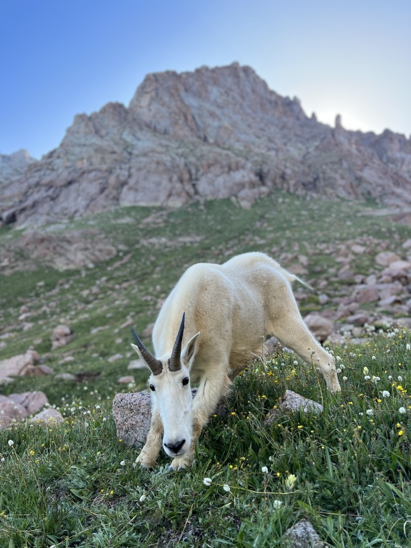 Day 4: Turret and Tie Creek Camp It was clear based on our campsite and available time that the best option would be the most direct option, aka going beneath the cliffs of Peak 15 in NY Basin to access the pigeon/turret saddle, tag turret, then camp in Tie Creek / North Pigeon Creek Basin in order to climb Pigeon early the following morning leaving enough time to hike out the unknown tie creek descent to the ruby trail in order to catch the train by 2pm. This would also avoid the descent and ascent needed to do the route from Ruby. We started our day with the final bit of down climb to the little finger saddle. There is a minor class 3 cliff band to navigate before the scree/tundra descent into NY Basin. Once in NY Basin, it is fun to marvel at the massive rock collapse of Eolus/West Eolus that littered this basin with school bus sized boulders. Flowers were out in force here and we took our time trying to smell a few while enjoying the morning light. Eventually we reach the Peak 15 junction and continue on our way under the cliffs. I fucked up navigating here a couple of times. There are multiple larger gullies you should just go down and under instead of trying to traverse through as you’ll just end up in loose steep bullshit. There is a goat/elk/use path through most of it which is helpful but it still led us into some trouble. Overall just plain tiring. Once past the gullies we had to gain the pigeon/turret saddle. I once again navigated a bit incorrectly and led us a bit more west than we needed to be near the top, which required a bit of a class 3/4 traverse through a rock band to gain the correct saddle. Sorry Zofia. It was at this point that I noted that it was pretty hot and I hadn’t eaten more than 400 calories all morning. I was in pain with almost every step. My stomach does not cooperate well with the heat I have learned, so I did my best to sip water and take in a snack. We dropped our full packs at the saddle and hid them with many rocks so they were harder to chew on. I wore the fanny with 500ml water bottle for the both of us (250 each) and a protein bar each for the summit. We brought rain jackets just incase, although I wasn’t worried. Plus mini first aid kit comprised of a compression wrap and gauze. The route to Turret from here is straightforward and I won’t go into it. Class 2. Beautiful summit views and Verizon LTE service on top. I managed to choke down my builders bar and 100ml of water to digest it. So glad most of the vertical gain is over for the day because I am suffering and moving slow. Zofia is strong and crushing. She almost likes the heat. We make our way back to the saddle, pick up our packs, and start descending into Tie Creek. I’m hoping to find a campsite as high as possible to eliminate unnecessary gain the next morning towards Pigeon. We manage to do so where a spring emerges around 12,100’ near a million blossoming flowers and even more black flies. The flies graciously don’t bite us, but they certainly like landing and crawling on everything possible. This is when we met George. Well, we named him George. He is the sole goat of Tie Creek Basin to our observations. I believe he was mentioned in blazintoes condition update from February when she was working on finishing the winter centennials. He behaved like a dog in ways. Laid down near us very casually and was digging from grubs and scratching behind his ear with his hind leg. Obviously he was hanging around for our electrolytes but this was really unique behavior I hadn’t seen in a goat before. He even appeared to be taking in the sunset with us for a while as we were shooting photos during golden hour. And let me tell you, the sunset views from Tie Creek Basin are dramatic. Certifiably even better than from 13,000’ the night before. The basin is relatively short/shallow so the descent into the valley is steep, meaning the view is jam packed with the peaks from across the animas, in addition to the lower cliffs of pigeon being lit up behind us. I had a special double ramen tonight and a few turkey jerky sticks in addition to plenty of snacks once I had cooled off a bit and set up the tent. Getting those calories in me was magnificent after only 700 calories all day up until camp.