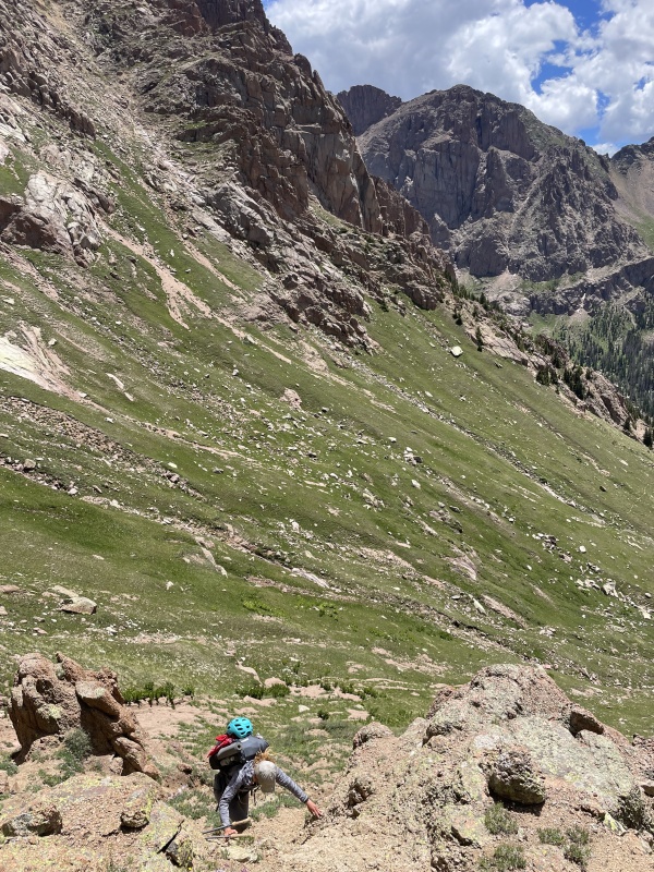 The Weminuche Wash-up Jupiter Eolus & North Eolus Pigeon & Turret 25.5 miles 12,800’ gain 1,004’ gain per mile Participants: Ian (@roughlysomewhere) Zofia (@zofiaslens) Preamble I’ve been eager to get back into the Weminuche ever since an early Sept 2021 excursion involving Jagged, Peak 6 to 7, the Guardian, and Silex with my good buddy shattuck311. Over the winter I scoured trip reports and gpx files on gaia, endlessly weighing the options of different routes to grab Jupiter, Pigeon, and Turret in one trip in an effort to finish the centennials this season. I decided to draw my own gpx route with multiple options in caltopo based off a few choice trip reports (including Andrew Hamilton’s Weminuche wipeout link up) in addition to the use of slope angle shading to reveal possible points of access and retreat. The no brainer was starting with Chicago Basin and hitting Jupiter first, in order to utilize the nice trail up CB with full packs instead of trying to ascend to the steeper and more rugged Ruby Basin trail. Options from there included going from Chicago Basin over Twin Thumbs pass to Ruby Basin while accessing Peak 13. Or going over North Eolus from CB to the little finger saddle used to access Peak 15. From little finger it looked like you could either descend to Ruby or traverse under the cliffs in NY Basin to gain the Pigeon/Turret saddle. This further had the option of camping in Tie Creek aka North Pigeon Creek, which seemed intriguing. I love new territory. Ultimately my curiosity to explore NY Basin, Tie Creek Basin, and the route over North Eolus won out, although this was not necessarily decided until we were on route. The following includes a bit of a tale and some various details about our journey… Prep & Partner First off, when planning this I had no one necessarily in mind to hike with and intended to potentially go solo. But, by chance, I happened to meet a new awesome partner named Zofia who is pretty fucking badass and, despite not having much experience in this space, wanted to join me. She would be working in Durango as a wilderness therapist with a 2 week on / 2 week off schedule, so we had plenty of time to make it work. With both of us coming off some leg injuries, Zofia offered to buy us train tickets in order to avoid the hike in and out of Purgatory. I was initially reluctant but, having not experienced the train yet, combined with the thought of saving more time and energy to be used in the deeper parts of the Wemi, I relented. Zofia had only climbed Quandary’s standard route (as far as colorado 13er/14er experience goes) by the time we had met in March. Together we climbed Sherman in April to which she performed admirably despite high winds and freezing temps. In June we took on some early season 13ers in Grand Turk, Sultan, and Hesperus, and capped it off with climbing Sneffels class 3 SW Ridge with plenty of snow still left. Then in early July 4-5 days before this Wemi trip, she confidently rose up to the occasion of climbing Dallas Peak with my buddy Matt and I. She was ready to go for a multi day link up. Personally I was feeling great. My injured foot from the winter was feeling healed and I couldn’t be happier or more ready. I had crossed off some really cool hikes/climbs already in June with the Matterhorn to Wetterhorn traverse, Teakettle & Coffeepot, NW Pole & Pole Creek to Half, as well as Dallas, and I was ready to continue the mountain adventures with an ultralight peak bagging link up. Gear wise, I used to work for an ultralight gear company and have hiked the Colorado Trail and few other long distance things. Going light is one of my specialties. With my carrying the tent and cook set, our packs weighed no more than 20-22 pounds each fully loaded and ready for 5 days. Based on condition reports, I decided against any traction or ice axes for either of us.