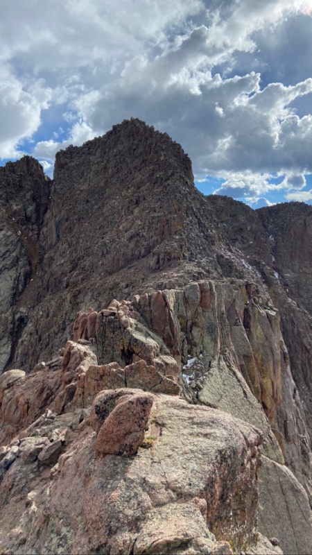 From the saddle, route finding to the notch is straight-forward. Moving up from the notch, the previous days moisture was starting to be a factor. Noticeable amounts of snow and slick rock were present, but I never felt like I needed more traction. I would say, in my opinion, from this point on it felt more like class 3 climbing than class 2. This section required some thought as to route finding and the best way forward. I found myself scrambling and using my hands most of the time. Ascend up the north side of the ridge and near the top you will come thru an opening where you will find the summit block. I made it to the summit of Windom by 7:32am.