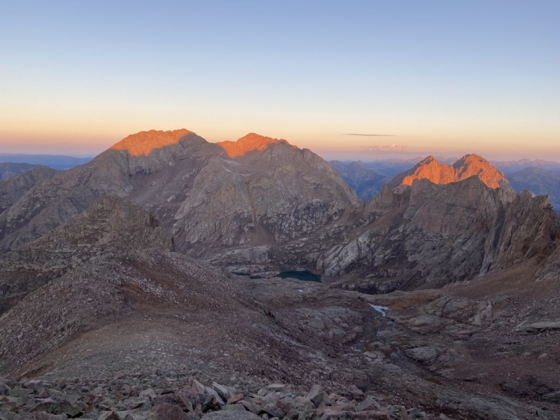 Day 2: Most of my climbing gear was wet from the day before, but I was able to put together enough dry clothes for the day and was on trail by 4:40am. From there I was able to make it back to twin lakes by 5:42am. I was originally concerned with the recent precipitation, but most of the rock seemed to be dry at this point. Not sure how the rock would be higher up, I elected to hit Windom first. Coming out of the twin lakes basin, you will hit a flat rock outcropping where it is time to head towards the Windom-Peak 18 saddle. This seems like a "pick your poison" section, where there are many routes you can take. I thought I stayed right enough, but once I got up higher, I noticed there was a more distinguished trail to my right. It also appeared that there is another route that stays lower and then gains the ridge further on. I made it to the saddle at roughly 6:50am.