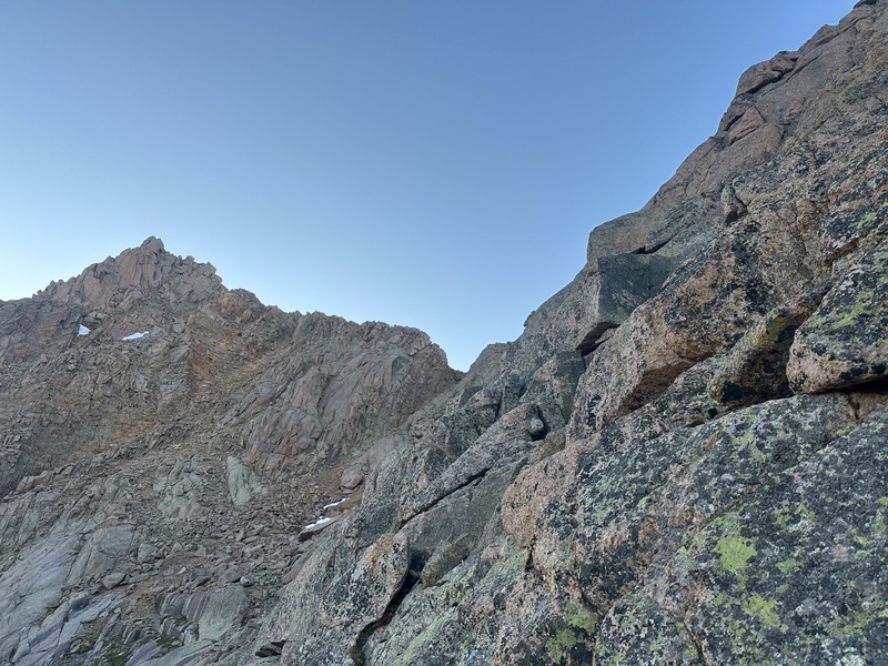 (The imposing face) The route I found is to cross up and to the left here, through the black marks in the center of the picture, wrapping around to the north side of the ridge. I was initially aiming for this crack, before realizing the chockstones in it are actually loose and couldn't be used as holds: