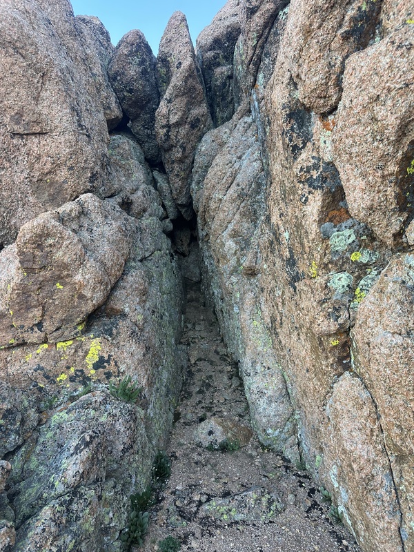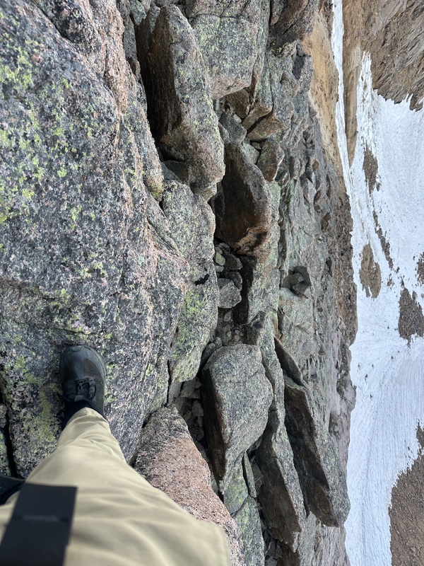 I am not normally spooked by exposure. I had no problem on Capitol's knife's edge, nor on Little Bear's west ridge, nor on Pyramid's leap of faith. In fact, I actively enjoyed all three of those obstacles. So naturally, I was going for the true summit of Sunlight, why wouldn't I? I dumped my pack at the base, stuck my sign in my waistband and headed up. No problem. And then I stepped down onto the penultimate block. And then I stared down at the third block. For sixty three minutes. I have never been so paralyzed by a move in my life. I considered versions of it sitting, standing, with one foot on each block, climbing down to an unseen fourth block, all of it looked horrible. I climbed back to the summit and tried the block on climbers left, which I halfway descended before running out of footholds and then climbed back up. I just felt like I had no way to use my hands to balance myself, it was all on my legs. The second block has close to nothing to grip off onto, which was something I should've taken closer note of while ascending. I ultimately decided that the safest thing would be to jump from the second block onto descender's left of the third, which had an upward ramp on the opposite side which I could use to steady myself as I landed. But before I'd go to make the move, my stomach would drop and I'd reset. I kept saying out loud to myself "come on, you're getting sunburned!". This had no effect.
