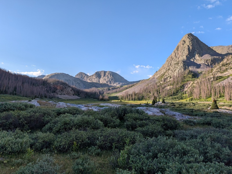 I made it back to camp at around 4:30, meaning I'd been going for about 12 1/2 hours with a short break setting up the tent as my only reprieve. I refueled, tried to drink enough water to rehydrate myself (failed), and hung out with Marshall back at camp before turning in for an early bedtime, knowing tomorrow was going to be one of the highlights of the trip. Day 2: P1, P2, P3, 13,229, Peters, 13,144, Weminuche Distance: 11.6 miles Vert: 5,400 ft. Difficulty: 4th class This was the day I was most excited to undertake. Everyone has glowing things to say about the Peters traverse, and I was ready to find out for myself. We got a pre-dawn start of 5 AM and backtracked down the Rock Lake trail for a couple of miles until we reached our turnoff. The meadow to cross looks chocked with willows, but they're the nice, friendly, knee-high willows, not the "oh my god where's the sky" kind of willows that sometimes appear. We probably should have angled a little further west before starting up the bushwhack slope, but we didn't, so we had some steep deadfall to navigate. After a couple hundred feet, we found a trail of sorts that meandered through the forest. We occasionally lost it, but always picked it back up again, and it spit us out in the meadow below P1.
