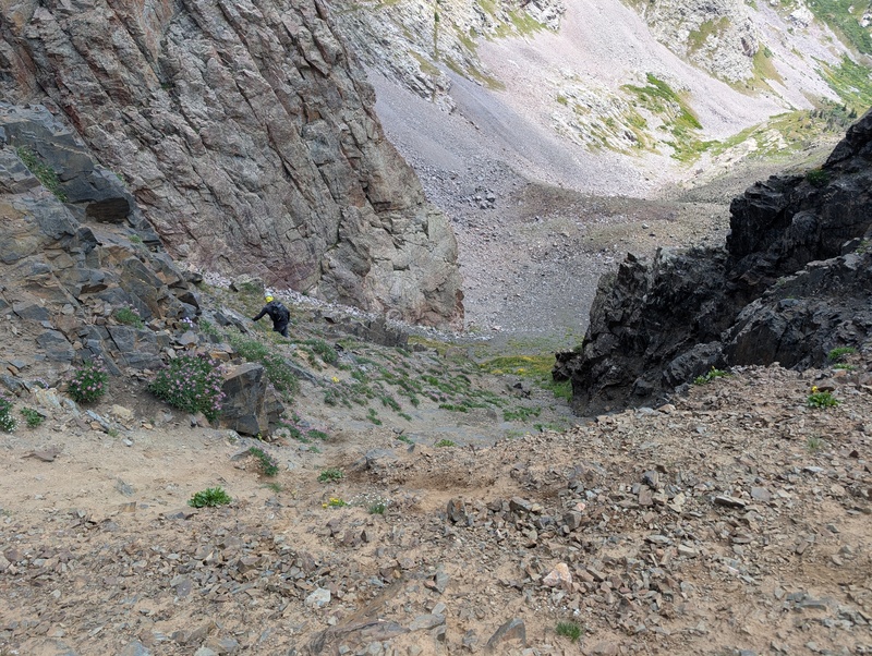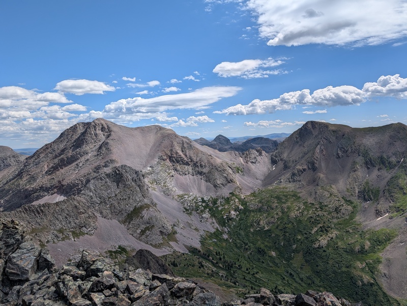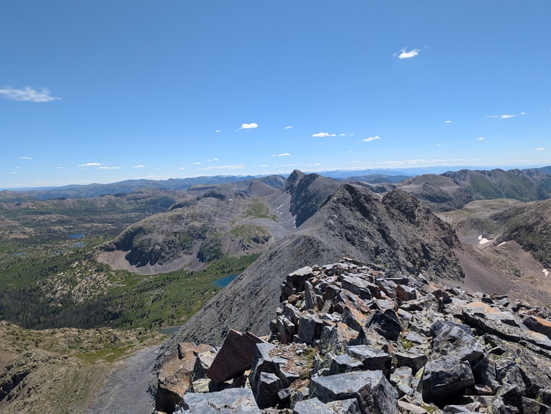 The rest of the way to Irving was, in one word....long. After descending the gully, there was still an entire broad basin to cross, complete with talus, willows, and trees (yep, had to drop below treeline), just to start heading uphill again. Still naive and weirdly fresh (trading a heavy pack for a day pack can give a false sense of invincibility), I went down, as fast as the loose talus would let me. I aimed to stay as high on the right as possible, but I had to end up below 12k feet in order to not sidehill nasty talus the entire way. The heat of the day started to pick up, and I began to feel the fatigue as I engaged Irving. A prominent ridge extends off the saddle with North Irving, and while I didn't tackle it from the very bottom, I wrapped around to the right, found some mildly loose terrain, and elected to climb up to the ridge. This led up to Irving's summit ridge, which went without incident, and I finally made the first summit of the trip! It only took about 15 miles to do so. It was right at the summit I ran into Marshall, who had done Oso first, then Irving. I also spied a couple of people exploring the ridge between North Irving and 13,027, which turned out (for the second time this year!) to be Heather Ryan, gallivanting around on a seldom-climbed unranked 13er. I made my stay on the summit of Irving a quick one and elected to skip North Irving, prioritizing getting to chat with Marshall a bit on the descent over an unranked 13er.