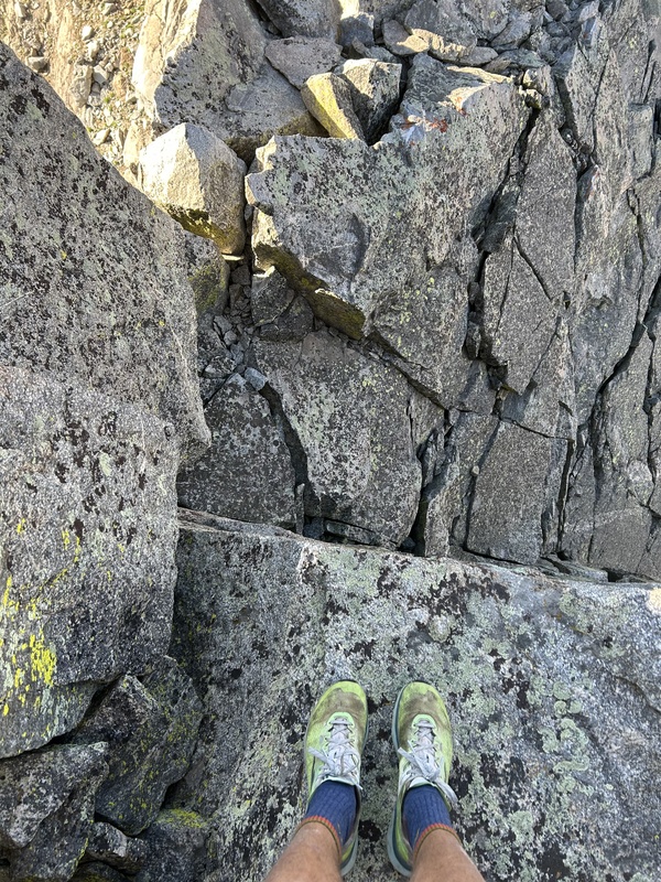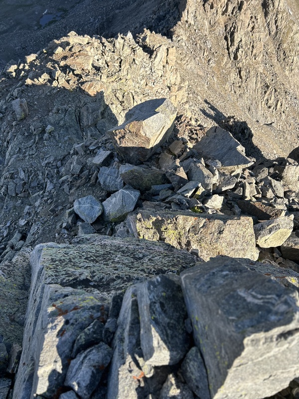 Kept scrambling until I reached the slabby knife edge. There was a chute off one side that could’ve gotten me to safer terrain, but the downclimb on the slab didn’t look too bad. Good feet, a couple decent rests, exposed on both sides but manageable. I faced in, made a few careful moves, traversed, and got down onto flatter rock. Looked back at the other option and felt I made the right call.