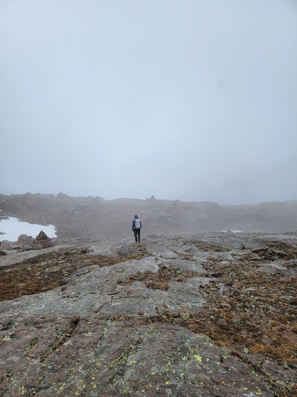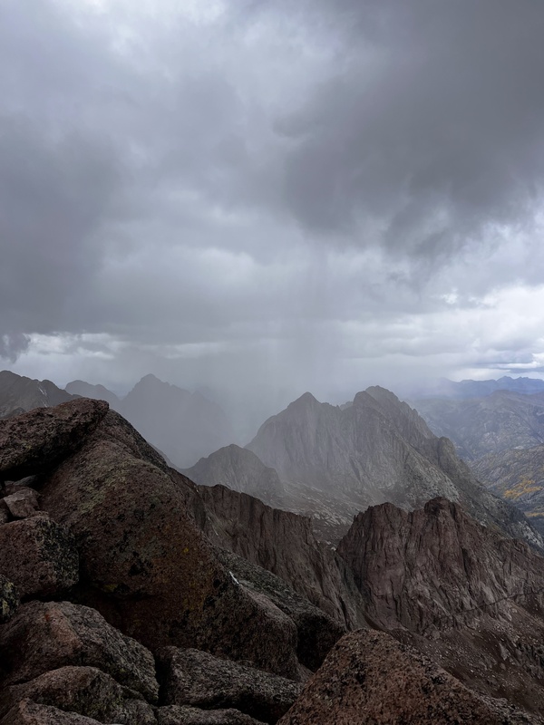 The snow came in an instant, so we needed to expedite our descent. Sean suggested we head down the east ramp that his party had skiied a few seasons prior. This was a little dicey due to some wet rock but was otherwise a viable way down - there was one distinct corner/chimney that was a low 5th downclimb (but not too exposed), then one more 4th class flake before we were able to rejoin the standard trail on the southern aspect.