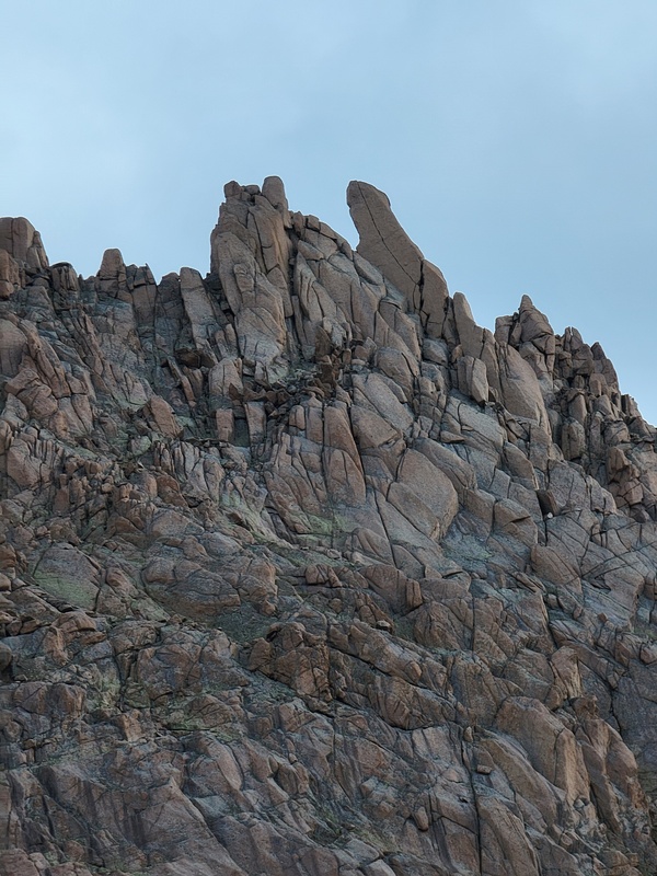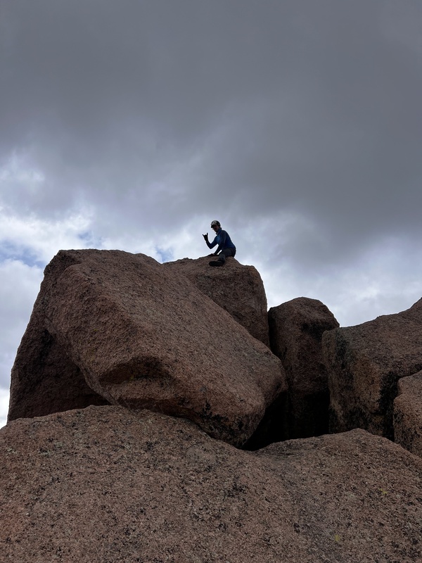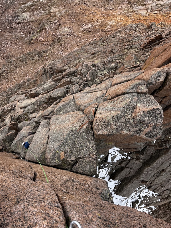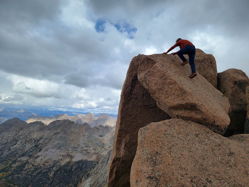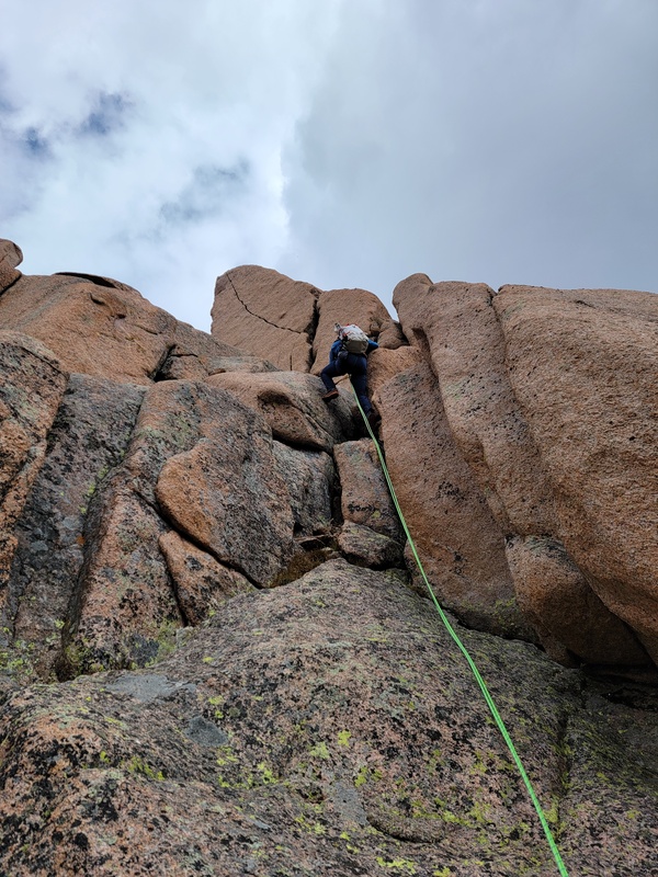 This downclimb was one of two or three low-5th class moves just before the base of the Spire. After this brief downclimb to the grassy ledge, there was an exposed right step made possible by a good left undercling on a boulder. This step is committing and height-dependent. Then we found ourselves on a spacious ledge 8 feet below the main belay ledge + rap anchor of the Spire. Two or three low-5th moves + a mantle gets you up the broken corner to the belay ledge. Indulge me for a minute: I've wanted to climb the Spire since the first time I read about it in Jim DiNapoli's Hall-of-Fame trip report https://www.14ers.com/php14ers/tripreport.php?trip=12717 sometime in 2018. This climb motivated me to learn crack climbing, inspiring a few ill-fated toprope solo sessions on cracks in the South Platte, including a particularly windy day on Scorpio Crack that ended in bloody knuckles and a tucked tail. I read on Mountain Project that it would be a good training climb, so off I went.