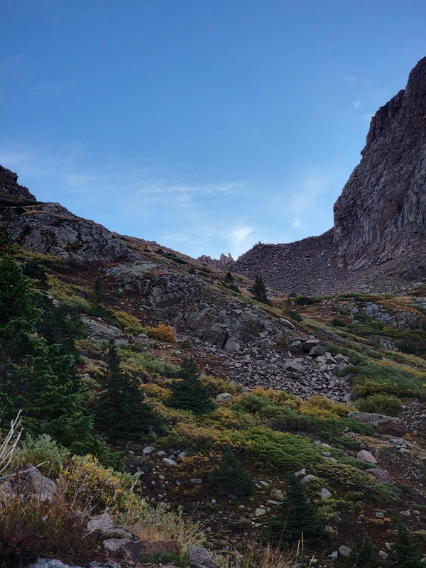 Intent on saving a little money and schedule flexibility, we opted to walk in from the Purgatory trailhead. Everything people say about this trail is true, it's easy to follow and genuinely a very beautiful hike, especially during the fall colors. Around 3.5 hours in, we hit the bridge over Needle Creek feeling invincible. Soon after, the wheels started to fall off. Not long after a rest at the New York Creek crossing, I started bonking. Sean had been nursing a cold for the last few days and by all accounts should have been at home in bed, but that didn't stop him from taking my rope, sleeping pad, electronics, and a few other things from my bag for the last 2 miles of trail up to the campsite. I was absolutely sucking wind, facing the consequences of a sedentary work-from-home lifestyle. It took us around 7 hours to get the 14 miles to our camp just below 11,000'. We ended up a few hours behind some train-riders but still found a great campsite near the creek.