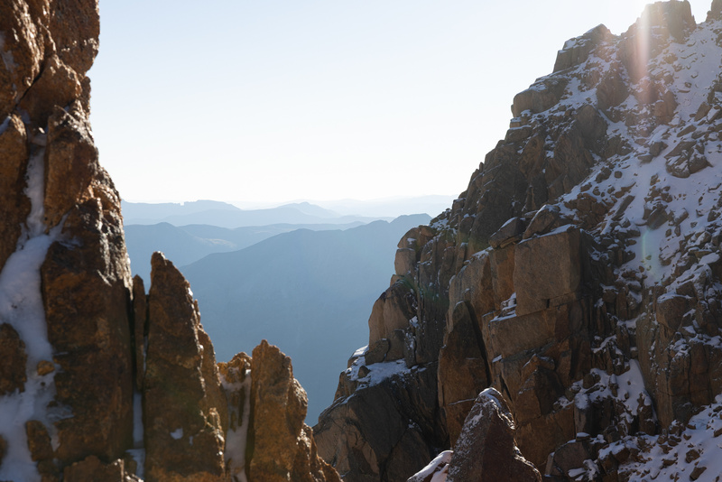 I was wide awake when my alarm went off at 4:30am the next morning, slightly nervous about an ambitious day in the mountains coinciding with my recent sleepless stretch. Cabe rustled awake and we triple-checked our summit packs for snacks and emergency layers while Christian boiled a quick pot of coffee. We took our time rehanging the bear bags and repairing a tear in my ultralight tent from the previous night’s hailstorm, and finally started up toward Twin Lakes just after 5:30am. First on the docket was Sunlight Peak—known for its exposed summit block, rumored to be the most difficult of any Colorado 14er standard route. We stopped at the upper lake to filter water once more, surrounded by a layer of glistening frost that blanketed peaks in all directions. The microspikes we left in Durango weren’t much help as we climbed the gully toward Sunlight Spire, moving slowly and steadily through 4-5” of fresh snow from the night before. My boots in particular were especially worn out, meaning each step required full concentration as we reached Class 3-4 terrain and buckled our helmets on. The following series of technical scrambling and problem-solving would have been super fun and playful in dry conditions, before a sneaky missed turn resulted in a brief reroute down a near-vertical slab. Negotiating the final few hundred feet to the summit required crossing from one side of the ridge to another through a tight window in the rocks, which we agreed was the highlight of the route. We paused to catch our breath as the sun crested Windom to the east, and found ourselves staring up at the notorious leap of faith right around 8:30am. Cabe topped out first and didn’t hesitate on his way up the final boulder problem, reaching the true summit before I had time to psych myself out deliberating. I snapped a couple photos and followed his lead, taking extra care on a particularly reachy move that was still coated in a thin layer of ice. The jump back down felt far less scary than advertised online, and we retraced our snowy footprints back toward Windom to set our sights on the next objective.