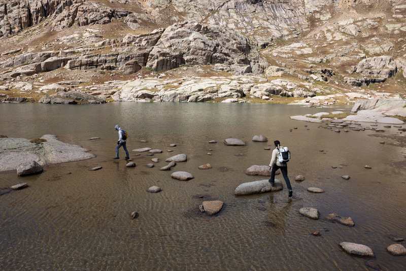 We stayed high on the traverse over to Windom, rock-hopping across the basin until we rejoined the standard route. Robb, a solo hiker we’d met on Sunlight, kept us company for the round-trip. Snow here was deeper than on Sunlight, and though the ridge scramble felt monotonous in comparison, the weather was perfect and the views wide open. Windom’s summit turned out to be small and blocky, more technical than expected and a nice surprise after the long plod. I found some respite from the wind in a narrow crack near the top, and celebrated with an Icelandic candy bar while Cabe and Christian took in the views. The way down from Windom was steady and uneventful until I managed to dislodge a small boulder, smashing my knee while trying to keep it from tumbling toward the group. Already behind schedule, we reached Twin Lakes again unsure whether we had enough juice left for the Eoluses. We decided we’d marinate on it over a hot meal and coffee, and hopped out to an island in the middle of the upper lake to bask in the sun and rejuvenate. We watched for two full hours as plate tectonics pulled the Eolus group further away, and eventually decided we’d honor whatever gods had rewarded us with a perfectly bluebird afternoon and give the two remaining peaks a shot.