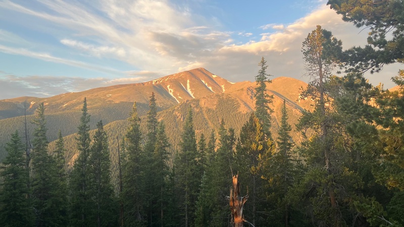 Hello everyone! This is my first stab at a trip report, so bear with me. Ever since I had gotten my hands on Gerry Roach's book I had my eyes set on this route, and this past summer I finally had the opportunity to climb it. Being from Minnesota this was much more intense than anything I have at home. My Dad and I got up around 4:00 am and left the VRBO that we were staying at in Leadville. It was just beginning to become light enough to see without a headlamp when we set off from the trailhead. We hiked a mile up the Colorado Trail before leaving the trail to the west (hikers left). Around a mile of wooded ridge stood between us and tree line, and I was pleasantly surprised to find that the forest was not excessively dense; the hiking up the gentle ridge was relatively unobstructed and easy. A few gaps in the trees provided spectacular views of Mt. Elbert, which me and my family had climbed two days prior.