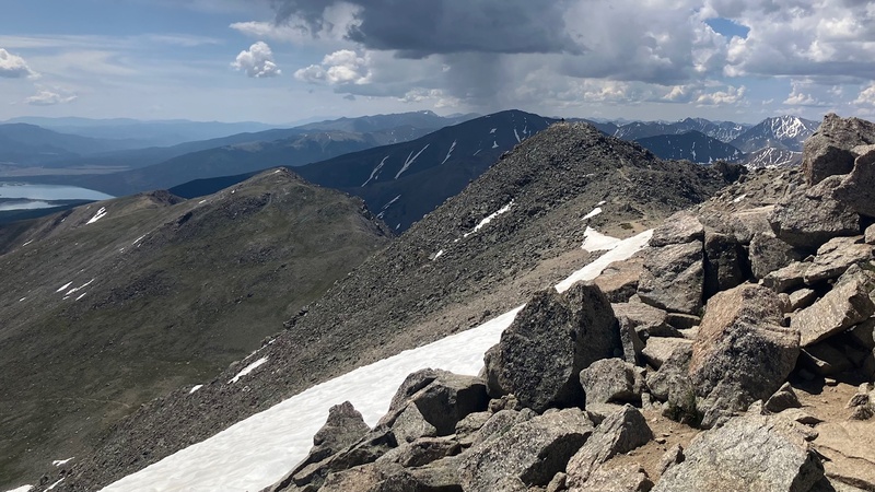 Amazingly we hadn't seen any other people since the moment we left the trail, but once we descended to the South Massive - Mt. Massive Saddle and got back onto the main Mt. Massive trail we started to see the traditional 14er deluge of hikers. It was nice to have a well established trail again, and after a short break for lunch we continued up the ridge and made it to the summit of Mt. Massive at 11:06 A.M. We didn't hang around very long because we could see a storm brewing to the west.