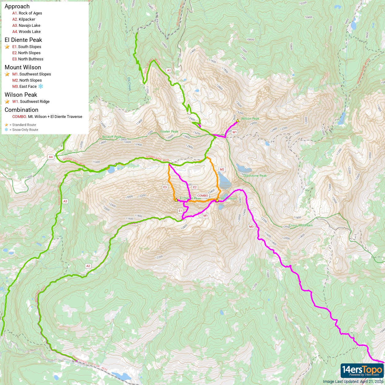 Wilson Peak - Southwest RidgeDifficulty: Class 3Total Elevation Gain: 3,900 feetRound-trip Distance: 10 mi |